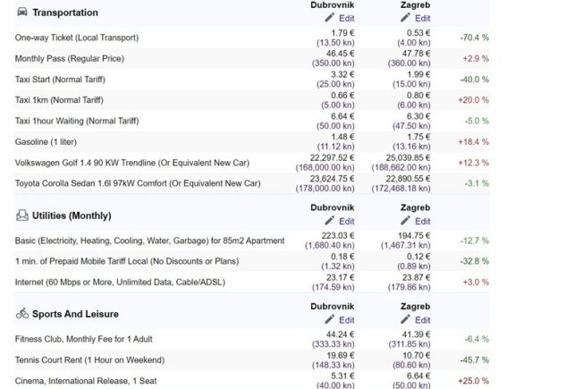 Velika razlika je u javnom prijevozu čije je odstupanje oko 70 posto. Tako je karta autobusna/tramvajska u Zagrebu samo 0,53 centa, dok je u Dubrovniku 1,79 eura. U Zagrebu je i taksi jeftiniji. Naime, start je 1,99 eura, a u Dubrovniku on iznosi 3,32 eura.