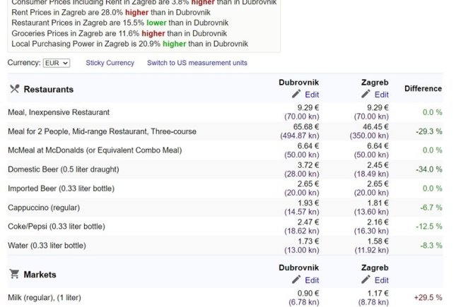 Kako bi usporedili život u Dubrovniku i Zagrebu, uzeli smo podatke sa stranice Numbeo, koja inače uspoređuje troškove života u svim gradovima i zemljama. Numbeo donosi kako je prosječna plaća u Dubrovniku 852,27 eura, a u Zagrebu 1069,81 eur.