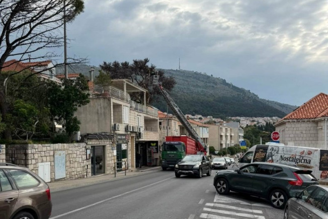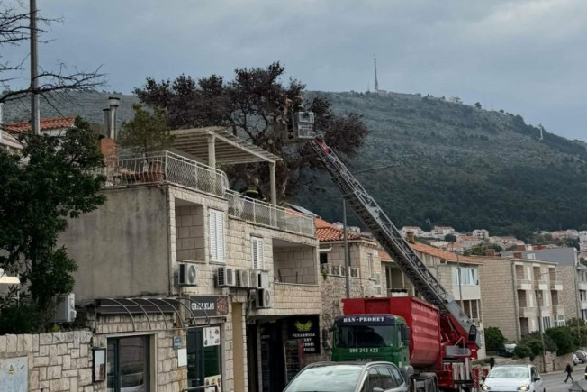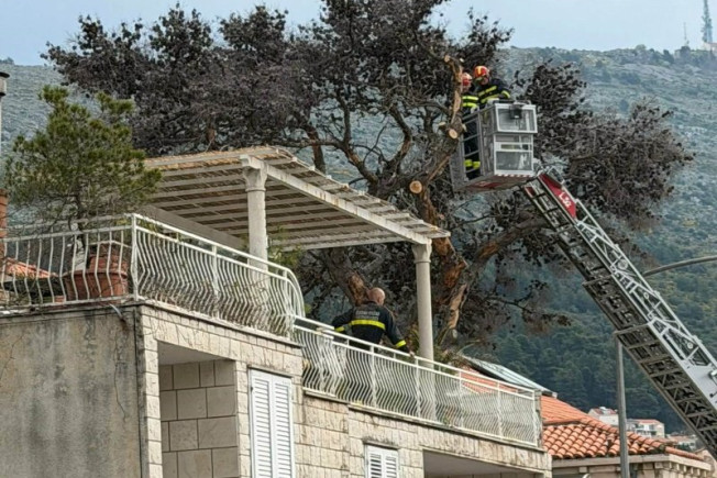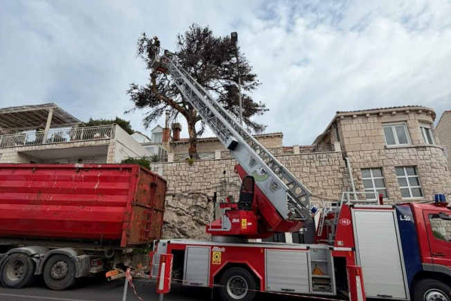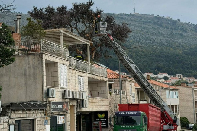 Djelatnici JVP Dubrovački vatrogasci jutros uklanjaju suhi alepski bor u Ulici Pera Čingrije 10, pored pekare Klas u dužini od 50 metara.