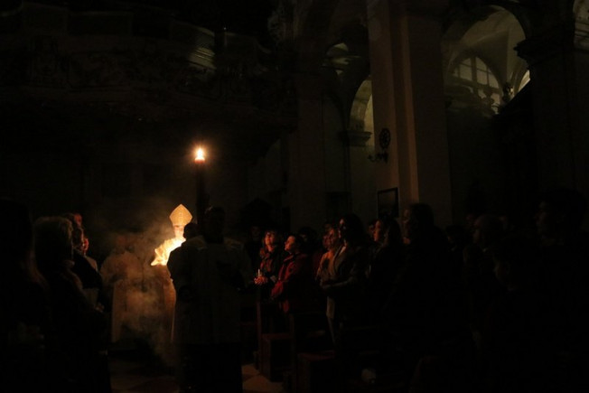 Liturgija Vazmenog bdijenja počela je uz izgašena sva svjetla u katedrali. Na ulaznim vratima biskup je od blagoslovljenog ognja zapalio svjetlo na velikoj uskrsnoj svijeći na kojoj se nalaze slova Alfa i Omega (Krist kao Početak i Svršetak) i četiri brojke tekuće godine. Potom je biskup na pet mjesta u križu na svijeći zaboo pet zrna tamjana koja označavaju pet rana Kristovih, uz riječi molitve: “Krist jučer i danas; Početak i Svršetak; Alfa i Omega; Njegova su vremena i vjekovi; Njemu slava i vlast po sve vjekove vječnosti. Amen“.