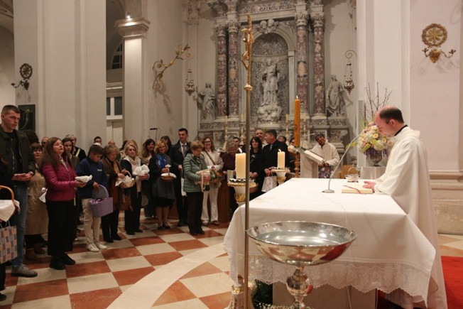 U krsnoj službi biskup je blagoslovio krsnu vodu i poškropio njome vjernike. Uz upaljene svijeće vjernici su obnovili krsna obećanja.