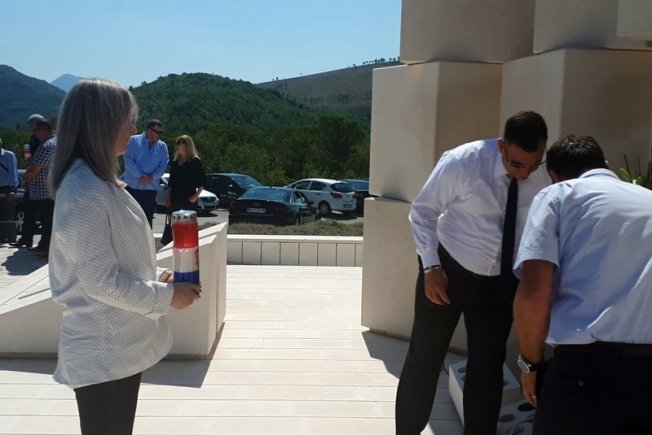 Pod kamenim kockama “Spomenika pobjede” koji je na Vjetrenom mlinu postavljen u svih poginulih branitelja na Južnom bojištu vijence su položili i svijeću zapalili zamjenica pročelnice Upravnog odjela za poslove gradonačelnika Marija Šimunović te gradski vijećnici Marijo Bekić i Ivo Lučić.