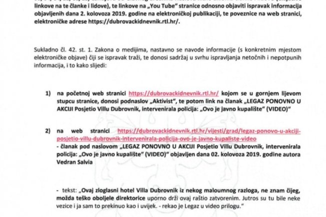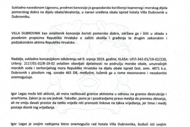 VILLA DUBROVNIK je ovlaštenik koncesije na dijelu pomorskog dobra ispred hotela Villa Dubrovnik na temelju Ugovora o koncesiji na pomorskom dobru zaključenim sa Dubrovačko-neretvanskom županijom dana 01. lipnja 2018. godine, Klasa: 947-01/17-01/135, Urbroj: 2117/1-01-18-17 (dalje u tekstu: Ugovor), navode iz Ville Dubrovnik čije demantij na današnji napis 'LEGAZ PONOVO U AKCIJI Posjetio Villu Dubrovnik, intervenirala policija: 'Ovo je javno kupalište!' (VIDEO)' prenosimo u cijelosti.