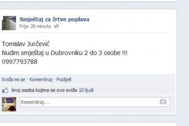 Na Facebook stranici Smještaj za žrtve poplava javio se Tomislav Jurčević koji nudi smještaj za 2-3 osobe u Dubrovniku.