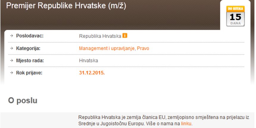 Na portalu Posao.hr osvanuo je oglas u kojem Republika Hrvatska traži zaposelnika. No, ne radi se bilo kakvom zaposleniku, već o - premijeru Republike Hrvatske!