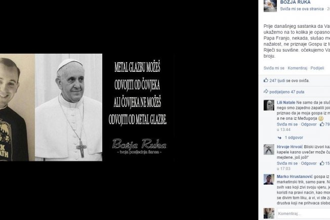 Čak je i metal glazba detektirana kao zlo, a kritike su upućene i papi Franju. 'Da Vam još jednom ukažemo na to kolika je opasnost od metal glazbe. Papa Franjo, nekada, slušao metal glazbu a danas, nažalost, ne priznaje Gospu iz Međugorja. Riječi su suvišne,' stoji u objavi. Osim toga, kao prijetnju ka 'duhovnom miru' prepoznali su i glazbenika Damira Urbana kojeg su proglasili pedofilom, a pohvaljen je Zlatan Stipišić Gibonni koji je 'odbacio metal, muziku Sotone, koja vodi na krivi put'. Jedini, po njima prihvatljiv metal je 'kršćanski' ili 'white metal', a omiljeni takav izvođač im je Marko Perković Thompson.