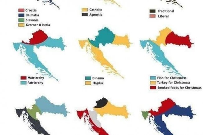 Uz klasičnu teritorijalnu podjelu na četiri regije ili vjersku (vjernici/agnostici) te svjetonazorsku (konzervativci/liberali) karta nudi duhovito pojednostavljenu podjelu na područja gdje se navija za Dinamo ili Hajduk, ali i onu koja se tiče gastronomskih običaja – gdje se za Božić jede riba, gdje purica, a gdje šunka i kobasica.