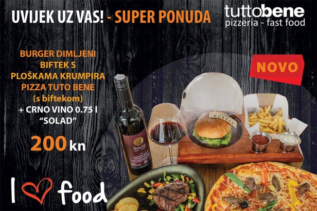 Dimljeni burger, Biftek s ploškama krumpira i Pizza Tutto Bene sa biftekom, uz što serviramo crno vino "Solad" 0,75l, definitivno je super ponuda koju trebate provati samo za 200 kn.