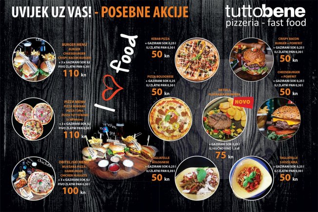 - Pizza Menu za 110 kn: Pizza Romana + Pizza Tuna + Pizza Tutto Bene (sa biftekom)