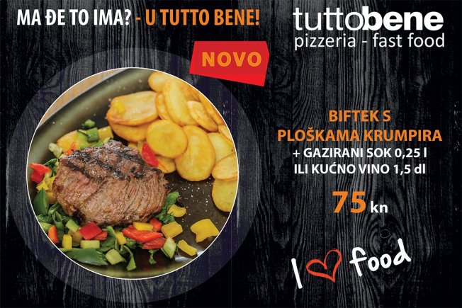 Za kraj Vam otkrivamo i izmjenjenu posebnu ponudu: Biftek s ploškama krumpira uz koji Vam serviramo i gazirani sok (0,25 l) po izboru ili kućno vino (1,5 dl). Sve to po cijeni od 75 kn.