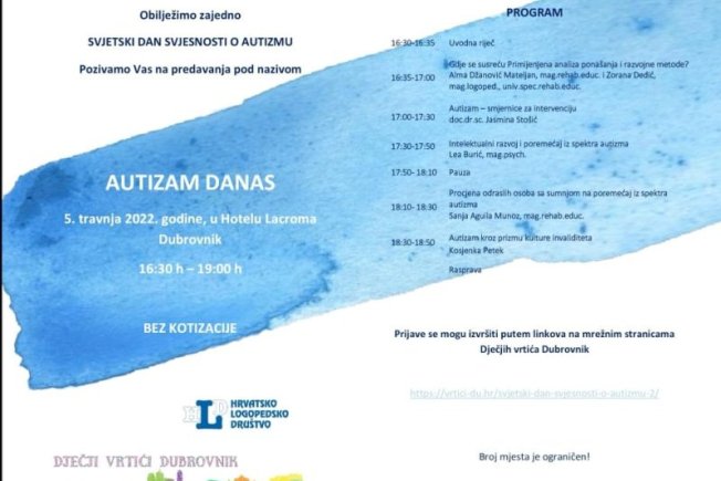 Predavanja pod nazivom 'Autizam danas' povodom obilježavanja Svjetskog dana svjesnosti o autizmu održat će se 5. travnja s početkom u 16:30 sati u hotelu Lacroma Dubrovnik.