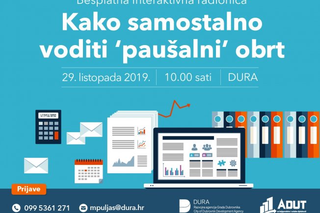 Dubrovačka razvojna agencija nastavlja sa Startup Akademijom. U suradnji s tvrtkom „Adut“ organizira besplatnu radionicu “Kako samostalno voditi “paušalni” obrt” koja će se održati u utorak, 29. listopada 2019. g. u prostorijama DURA-e (Branitelja Dubrovnika 15, 20000 Dubrovnik) s početkom u 10:00 sati.