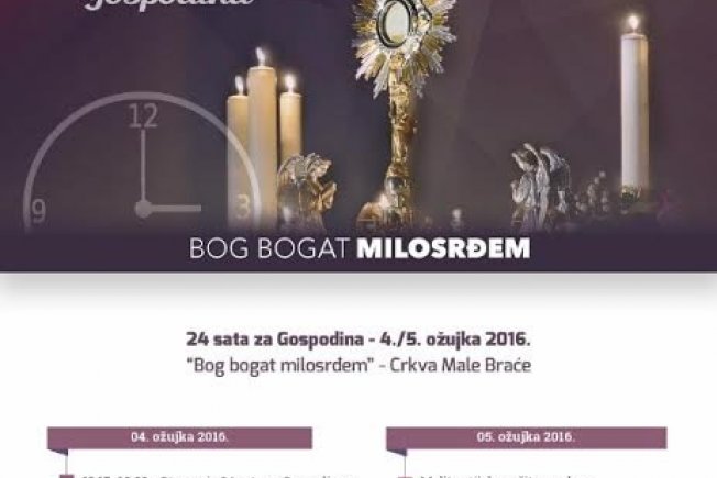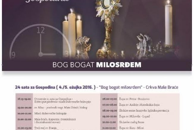 Molitvena inicijativa "24 sata za Gospodina" započinje pobožnošću križnog puta u crkvi Male braće u petak 4. ožujka u 18.15 sati, a nastavlja se svečanom misom otvorenja u 19 sati koju će predvoditi dubrovački biskup mons. Mate Uzinić. Nakon mise u 20 sati, bit će izložen Presveti Oltarski Sakramenat nakon čega slijedi cjelonoćno klanjanje pred Presvetim.