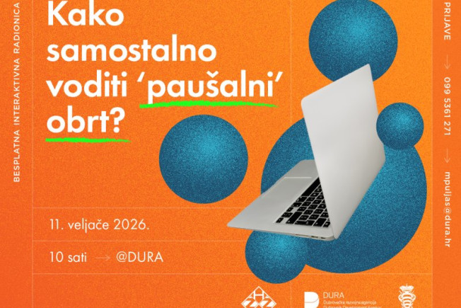 Dubrovačka razvojna agencija ovaj put u suradnji sa Hrvatskim zavodom za zapošljavanje (HZZ) organizira radionicu “Kako samostalno voditi paušalni obrt”, koja će se održati 11. veljače 2026. u prostorijama DURA-e (Branitelja Dubrovnika 15, 20000 Dubrovnik) s početkom u 10.00 sati. Radionica će trajati 4 sata.