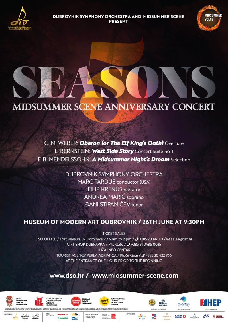 Obljetnički koncert i tradicionalna suradnja ovog festivala i Dubrovačkog simfonijskog orkestra publici donosi prigodan i drugačiji program nego prethodnih godina. Orkestrom će ravnati američki dirigent Marc Tardue, a na programu su uvertira opere Oberon C. M. Webera, izbor iz Sna ljetne noći F.B. Mendelssohna te izbor iz Bernsteinovog mjuzikla West Side Story gdje će kao solisti nastupiti dubrovačka sopranistica Andrea Marić i tenor Đani Stipaničev. Glazbenu večer naracijom će pratiti glumac Filip Krenus.