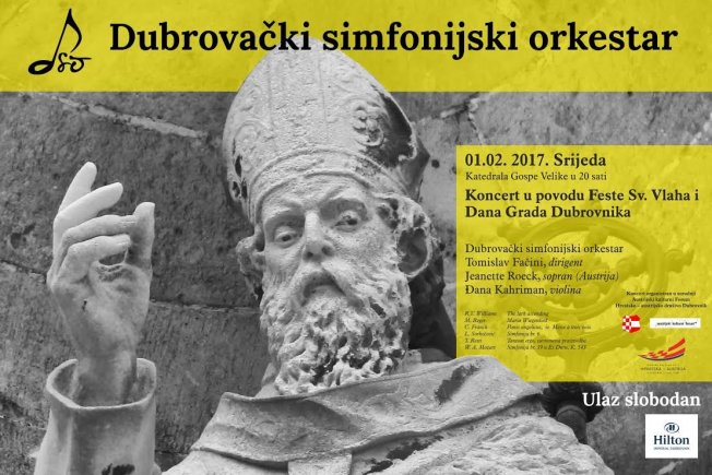 Dubrovački simfonijski orkestar najavljuje koncert u povodu Feste sv. Vlaha i Dana Grada Dubrovnika. Koncert će se održati u srijedu 1. veljače u Katedrali, s početkom u 20 sati. Orkestrom će ravnati maestro Tomislav Fačini, a kao solistice će nastupiti sopranistica Jeanette Roeck i violinistica Đana Kahriman. Ulaz na koncert je besplatan.