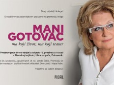 Predstavljanje knjige Mani Gotovac „Ma koji život, ma koji teatar“ u izdanju Profila održat će se u srijedu, 10. prosinca s početkom u 18 sati u Narodnoj knjižnici, Ulica od puča. O knjizi će, uz autoricu, govoriti Vanda Babić, a sudjelovat će i Đelo Jusić te klapa Kaše.