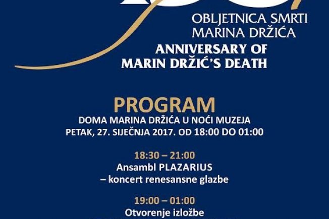 Tijekom manifestacije Noć muzeja 2017. godine Dom Marina Držića bit će otvoren za posjetitelje do jedan sat poslije noći te je svim posjetiteljima ulaz besplatan.