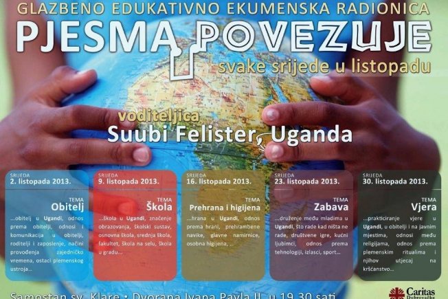 Caritas Dubrovačke biskupije organizira glazbeno-edukativne radionice koje će voditi volonterka Suubi Felister iz Ugande. Dubrovačka studentica svaki put će govoriti o drugoj temi. Prisutne će Suubi također pokušati naučiti pjevati duhovne pjesme na jeziku Ugande kao i tradicionalne plesne korake. Program radionica pronađite dolje.