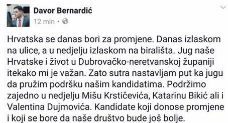 'Hrvatska se danas bori za promjene. Danas izlaskom na ulice, a u nedjelju izlaskom na birališta. Jug naše Hrvatske i život u Dubrovačko-neretvanskoj županiji itekako mi je važan. Zato sutra nastavljam put ka jugu da pružim podršku našim kandidatima. Podržimo zajedno u nedjelju Miša Krstičevića, Katarinu Bikić, ali i Valentina Dujmovića. Kandidate koji donose promjene i koji se bore da naše društvo bude još bolje,' objavio je Bernardić.