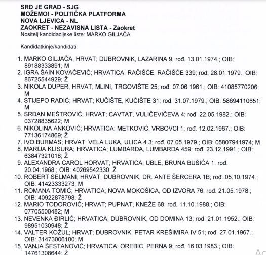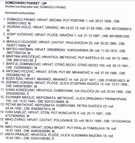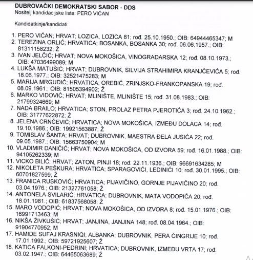 Županijsko izborno povjerenstvo objavilo je pravovaljane kandidature za izbor župana i zamjenika župana Dubrovačko-neretvanske županije, kao i liste za Županijsku skupštinu. Za mjesto župana natječu se Nikola Dobroslavić (HDZ), Marko Giljača (Srđ je Grad), Karlo Gjurašić (DUSTRA), Terezina Orlić (DDS), Božo Petrov (Most) i Roko Tolić (nezavisni kandidat kojeg je podržala lista SDP-HNS).