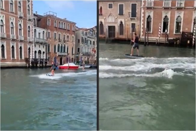 Gradonačelnik Venecije kritizirao je u srijedu "dva idiota" koji su snimljeni kako surfaju Canalom Grande, obećavši besplatnu večeru onome tko ih identificira.