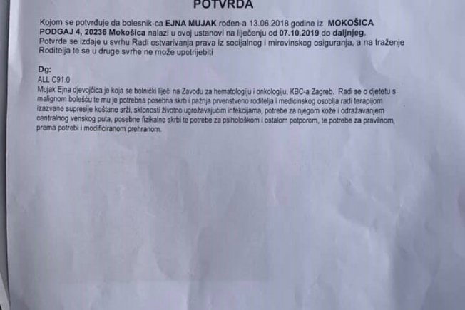 Djevojčica Ejna Mujak iz Mokošice ima teški oblik leukemije.