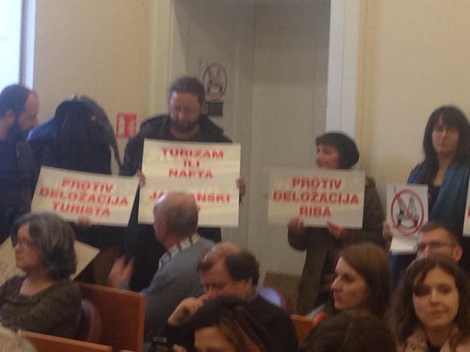 U vijećnici su prisutni i članovi Živog zida i drugih udruga koji su izlagače dočekali s transparentima u kojima upozoravanju na moguću štetu za Jadran i turizam s potencijalnim dolaskom naftnih platforma.