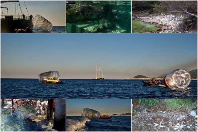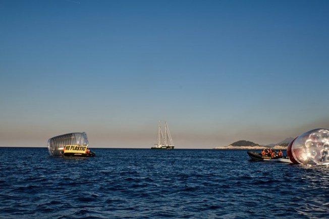 U moru ispred poznate plaže Saplunara plutale su golema boca, čaša i slamka simbolično poručujući da se u Mediteranu već sad nalazi 1455 tona plastike.