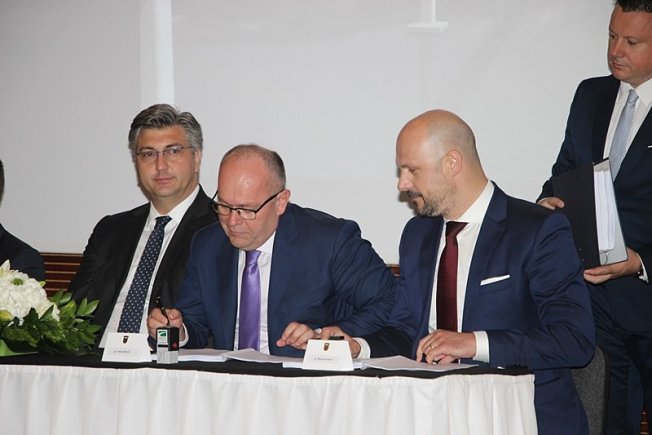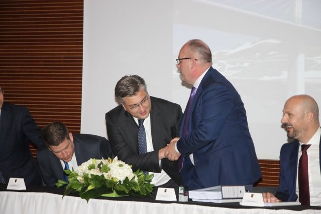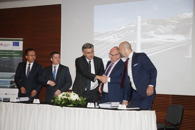 U nazočnosti premijera i ministra mora, prometa i infrastrukture Olega Butkovića, Ugovor s izvođačima radova za izgradnju mosta kopno-Pelješac s pristupnim cestama potpisao je predsjednik Uprave Hrvatskih cesta Josip Škorić i opunomoćeni predstavnik konzorcija/zajednice ponuditelja Zhang Xiaoyuan.