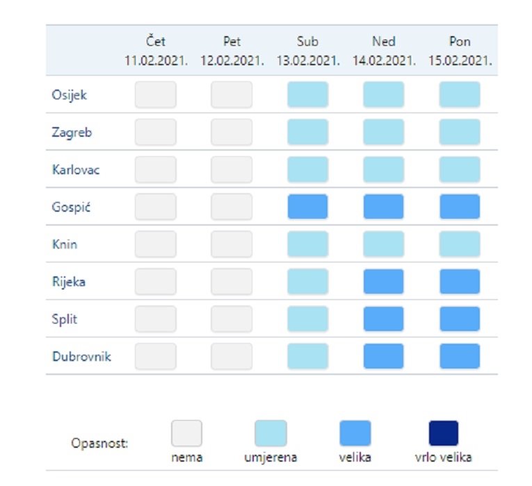 Za subotu, nedjelju i ponedjeljak je izdano upozorenje od hladnog vala i za krajnji jug Hrvatske. Opasnost od hladnog vala za subotu je umjerena, a nedjelju i ponedjeljak velika.