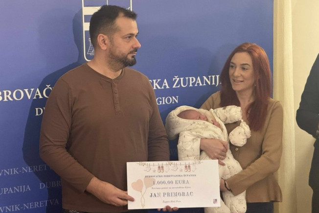 Župan Blaž Pezo danas je simbolično uručio po tisuću eura - prvorođenoj bebi i prvim trojkama u Dubrovačko-neretvanskoj županiji u ovoj godini. Tom prilikom je kazao kako su za 2026. godinu osigurali milijun eura u proračunu za ovu demografsku mjeru.